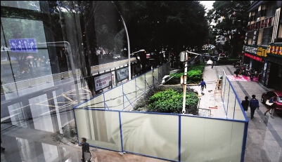 11日一早,记者在省立医院南门对面的旗汛口公交站(新亚大厦旁)看到,几个工人正在架设施工的围挡,围挡占用了约一半的人行道。