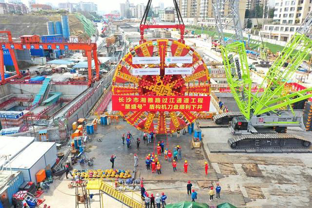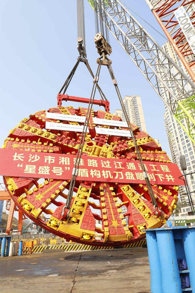 2月21日下午,湖南省最大直径盾构机——湘雅路过江通道泥水平衡盾构机刀盘正式吊装进入盾构始发井,“星盛号”盾构机成功装上“巨牙”,这也标志着湘雅路过江通道项目盾构机主机组装进入收尾阶段。
