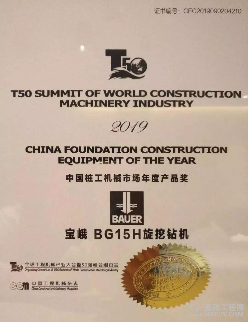 图为宝峨BG 15 H旋挖钻机荣获中国桩工机械市场年度产品奖