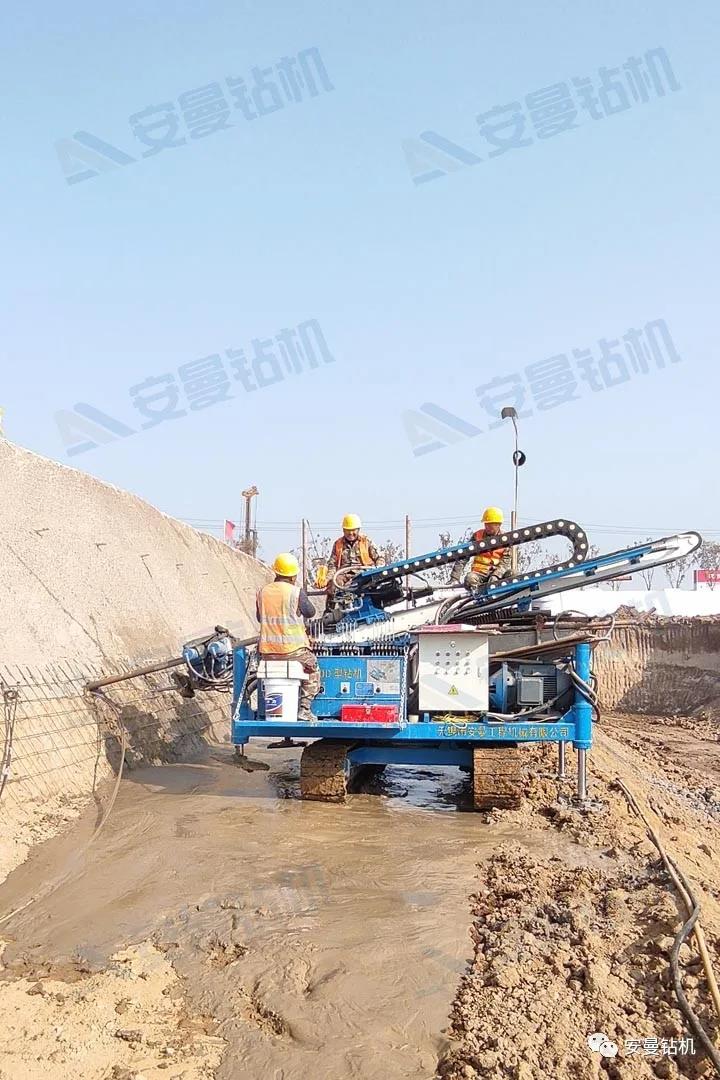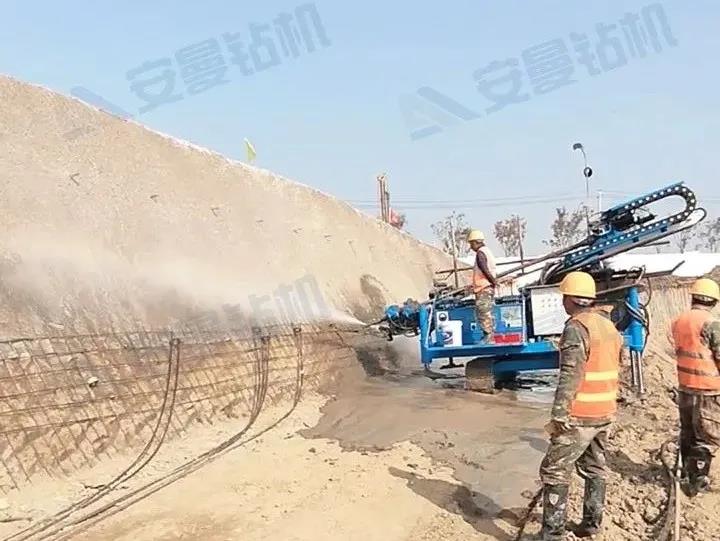 3、安装76钻杆和钻头套上旋喷锚索,启动高压泵压力10Mpa,钻进施工;