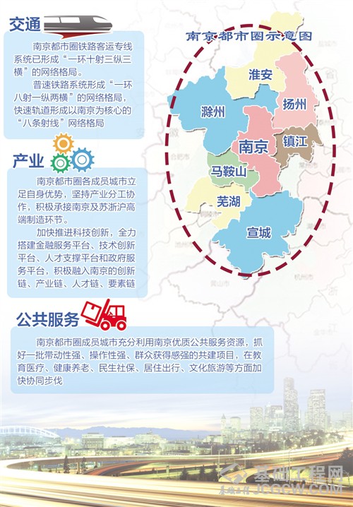 此外,南京都市圈还将重点推动主枢纽、主景区、主城区之间的快联快通,加密过江通道建设,加快形成宁镇扬、宁滁30分钟快速通勤圈、1小时休闲旅游生活圈、1小时生产要素物流圈。