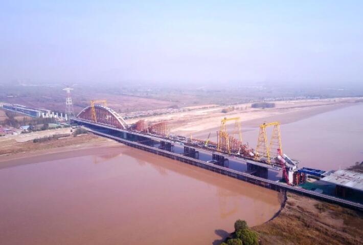 7日,航拍济南齐鲁黄河大桥建设现场。整个桥梁宽阔的桥面已经基本建成,北侧弧形拱肋已经耸立起来,中间420米的大型主跨拱肋正在施工中,现场十分雄伟。